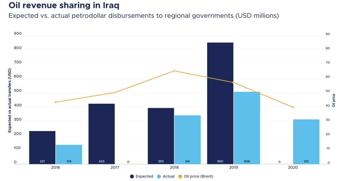 This analysis is based on data from Iraq’s EITI Reports for the fiscal years 2016 to 2020. See also the Natural Resource Governance Institute’s revenue sharing case study and infographic.